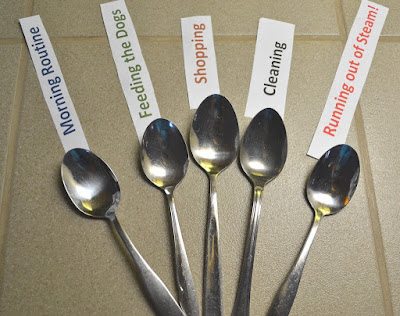 Pedi-lhe para fazer uma lista das tarefas do seu dia, incluindo as mais simples. Quando, ela recitou tarefas diárias, ou as coisas divertidas para fazer, eu expliquei que cada uma lhe custaria uma colher. Quando ela ditou, como a sua primeira tarefa da manhã, ficar pronta para trabalhar, eu interrompi-a e tirei-lhe uma colher. Praticamente passei ao “ataque”. Eu disse: "Não! Não podes simplesmente te levantares. Tens de abrir os teus olhos, e então perceberes que estás atrasada. Tu não dormiste bem na noite anterior. Tens de rastejar para fora da cama, e então tens que fazer algo para comer antes de qualquer outra coisa, porque se não fizeres isso, não podes tomar o teu medicamento, e se não tomares o medicamento tu podes desistir de todas as tuas colheres para hoje e também para amanhã." Rapidamente lhe tiro uma colher e ela percebe que ainda nem sequer se vestiu. Banho custa uma colher, apenas para lavar o cabelo e fazer a depilação. Os altos e baixos no início da manhã podem realmente custar mais do que uma colher, mas eu pensei em dar-lhe um desconto, não queria assustá-la imediatamente. Vestir custou outra colher. Parei-a e pormenorizei cada tarefa para lhe mostrar como cada pequeno detalhe precisa de ser pensado. Tu não podes, simplesmente vestir qualquer tipo de roupa, quando estás doente. Eu expliquei-lhe que eu tenho que ver quais as roupas que consigo vestir, se as minhas mãos doerem naquele dia os botões estão fora de questão. Se tenho hematomas naquele dia, preciso usar mangas compridas, e se estiver com febre preciso de uma camisola para ficar quente e assim por diante. Se o meu cabelo está a cair preciso gastar mais tempo para estar apresentável, e então tu precisa de ter outros 5 minutos em consideração, para se sentir mal porque demorou 2 horas para fazer isso tudo.